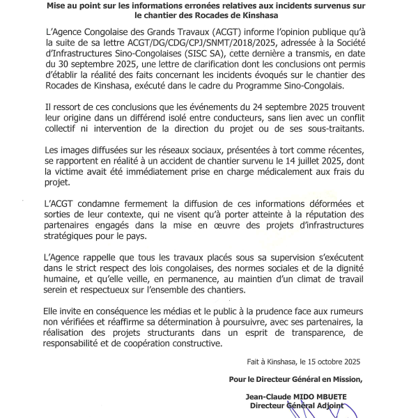 Toute l’actualité de l’ACGTParticipation remarquée de l’ACGT au Forum Sino-Congolais de Zhejiangnovembre 8, 2025Alpha MuyokoLire plus ACGT : Le Gouverneur intérimaire du Haut-Katanga en visite sur le chantier Kasomeno–Kasenga–Chalweoctobre 27, 2025Alpha MuyokoLire plus Travaux de modernisation de la voirie au Kongo central : le bétonnage de la boucle de Kisantu avance à pas de géantoctobre 18, 2025Alpha MuyokoLire plus Projet Intégré de Tramway de Kinshasa : le Gouvernement pose les bases du futur contrat de Partenariat Public-Privéoctobre 16, 2025Alpha MuyokoLire plus Mise au point sur les informations erronées relatives aux incidents survenus sur le chantier des rocades de Kinshasa le 24 septembre 2025octobre 15, 2025Alpha MuyokoLire plus L’Agence Congolaise des Grands Travaux à la 10ᵉ édition d’Expo Bétonoctobre 9, 2025Alpha MuyokoLire plus Praticabilité et modernisation de la Route Kananga – Kalamba-Mbuji : des avancées majeures constatées début octobre 2025octobre 6, 2025Alpha MuyokoLire plus Kongo-Central : la Première Ministre lance les travaux de la route Moanda–Yemaseptembre 29, 2025Alpha MuyokoLire plus Haut-Katanga : le Ministre John Banza s’imprègne du fonctionnement des routes concédéesseptembre 26, 2025Alpha MuyokoLire plus Concession Kasomeno-Mwenda : le Directeur Général de l’ACGT a ouvert les travaux d’évaluationseptembre 10, 2025Alpha MuyokoLire plus John BANZA LUNDA prend officiellement les commandes du Ministère des Infrastructures et Travaux Publicsaoût 13, 2025Alpha MuyokoLire plus Discours de Monsieur le Directeur Général de l’Agence Congolaise des Grands Travaux à l’occasion de la cérémonie du 28 juillet 2025 de lancementjuillet 31, 2025Alpha MuyokoLire plus 12345678