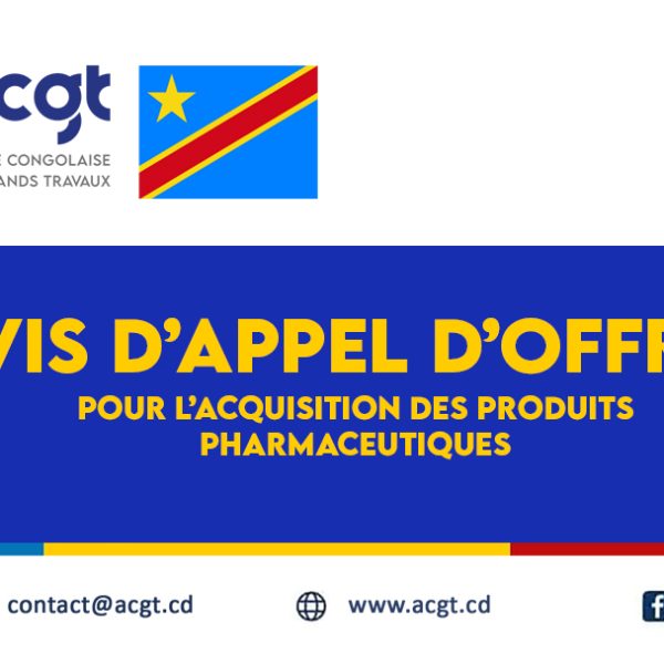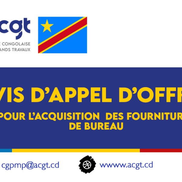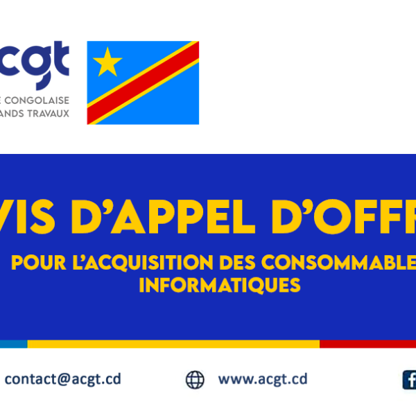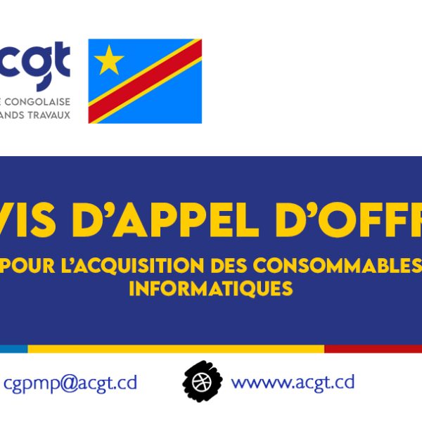 Toute l’actualité de l’ACGTHaut-Katanga : Lancement des Travaux de la Route Transfrontalière Likasi–Borne 32juillet 31, 2025Alpha MuyokoLire plus 📢 𝗔𝗩𝗜𝗦 𝗗’𝗔𝗣𝗣𝗘𝗟 𝗗’𝗢𝗙𝗙𝗥𝗘𝗦 – 𝗔𝗖𝗤𝗨𝗜𝗦𝗜𝗧𝗜𝗢𝗡 𝗗𝗘𝗦 𝗠𝗔𝗧𝗘𝗥𝗜𝗘𝗟𝗦 𝗜𝗡𝗙𝗢𝗥𝗠𝗔𝗧𝗜𝗤𝗨𝗘𝗦juillet 24, 2025Alpha MuyokoLire plus ACGT lance un avis d’appel d’offres relatif au recrutement d’un prestataire pour le service d’entretien et nettoyage desjuillet 18, 2025adminwsLire plus L’ACGT déploie une équipe d’experts pour les études de construction et de modernisation de la RN20juillet 10, 2025Alpha MuyokoLire plus Des avancées majeures sur la route Mbanza-Ngungu–Nkamba : un projet en hommage au prophète Simon Kimbangujuillet 9, 2025Alpha MuyokoLire plus L’ACGT lance un avis d’appel d’offre pour l’acquisition des fournitures de bureaujuillet 4, 2025Alpha MuyokoLire plus L’ACGT célèbre la 2ᵉ édition de la Journée des Femmes en Géniejuin 24, 2025Alpha MuyokoLire plus L’Agence Congolaise des Grands Travaux (ACGT) lance un appel d’offres pour acquérir les consommables informatiquesjuin 20, 2025Alpha MuyokoLire plus Le Ministre Provincial des ITP Lomami donne le coup d’envoi des travaux de reconstruction du pont Luilu et effectue une visite d’inspection sur lajuin 18, 2025Alpha MuyokoLire plus Avis d’Appel d’offres pour l’acquisition des produits pharmaceutiquesjuin 6, 2025Alpha MuyokoLire plus Kongo Central : L’ACGT Accélère la Modernisation des Infrastructuresmai 26, 2025Alpha MuyokoLire plus Visite de Madame la Première Ministre sur la Route Kananga-Kalamba-Mbujimai 26, 2025Alpha MuyokoLire plus 12345678