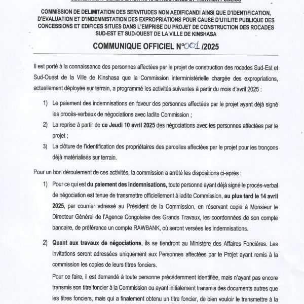 Toute l’actualité de l’ACGTAvancement des Travaux sur la Route Kananga–Kalamba-Mbujimai 14, 2025Alpha MuyokoLire plus Érosion à Kasangulu : Le ministre des Infrastructures salue la réactivité de l’ACGTmai 5, 2025Alpha MuyokoLire plus TANGANYIKA : L’ACGT et le Gouverneur Kitungwa Mobilisés pour Sauver les Infrastructures Routières Menacées par la Montée des Eauxmai 5, 2025Alpha MuyokoLire plus RN1 Mbuji-Mayi – MWENE-DITU-KANYAMA : Une Mission conjointe ACGT–SISC SA pour lever les obstacles aux travaux routiersavril 28, 2025Alpha MuyokoLire plus L’Agence Congolaise des Grands Travaux inspire la relève à l’Institut Kingabwaavril 24, 2025Alpha MuyokoLire plus Clôture du mois de la femme : Les Femmes de l’ACGT Valablement Représentéesavril 21, 2025Alpha MuyokoLire plus EXPO BETON 2025 : L’ACGT affirme son leadership dans le développement des infrastructures en RDCavril 21, 2025Alpha MuyokoLire plus Inspection de la DAP sur les rocades de Kinshasa : cap sur l’avancement des travauxavril 21, 2025Alpha MuyokoLire plus Erosion de Kasangulu : Trafic rétabli et efforts de consolidation des acquis des travaux d’urgence menés sous l’encadrement de l’Agence Congolaiseavril 11, 2025Alpha MuyokoLire plus COMMUNIQUE OFFICIEL N°001 /2025avril 8, 2025Alpha MuyokoLire plus Projet de la Route Kasomeno-Kasenga-Chalwe entre la RDC et la Zambie : le Président du Sénat reçoit en audience le Directeur Général de l’ACGT et leavril 8, 2025Alpha MuyokoLire plus Projet des rocades de Kinshasa : visite de l’Inspecteur Général, chef de service de l’IGFavril 3, 2025Alpha MuyokoLire plus 12345678