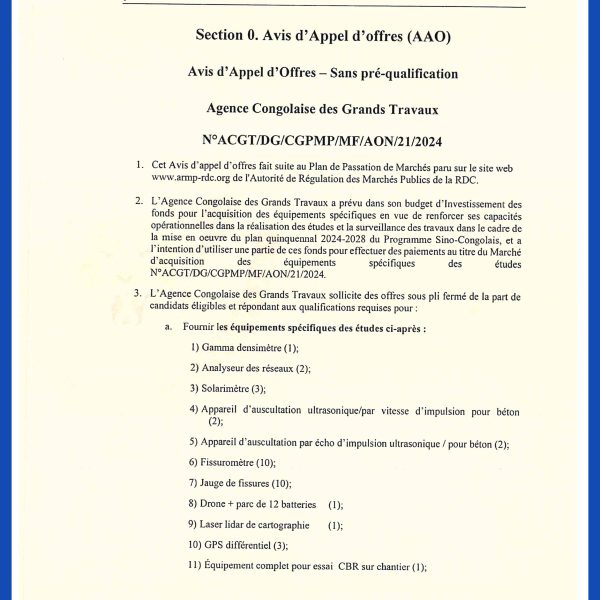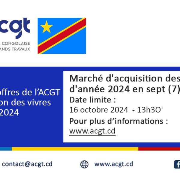 Toute l’actualité de l’ACGTOccupation harmonieuse des abords des rocades de Kinshasa : Inspection des ministres des ITP, Aménagement du Territoire, Urbanisme et Habitat le 09octobre 10, 2024Alpha MuyokoLire plus Réception provisoire des infrastructures routières : Lwambo-Mitwaba-Manonooctobre 3, 2024Alpha MuyokoLire plus Avis d’appel d’offres de l’ACGT pour l’acquisition des vivres de fin d’année 2024septembre 16, 2024Alpha MuyokoLire plus Le Ministre des Infrastructures et Travaux Publics évalue l’avancement des travaux de construction des rocades de Kinshasa ce mercredi 14 aoûtaoût 15, 2024Alpha MuyokoLire plus Avis d’Appel d’Offresaoût 12, 2024Alpha MuyokoLire plus Projet de construction et modernisation de la route Tshikapa- Kamako, évolution au 06 août 2024août 6, 2024Alpha MuyokoLire plus Arrivée du premier lot des matériaux de finissage du stade de Nyantendé à Bukavujuillet 21, 2024Alpha MuyokoLire plus Programme Sino-Congolais : Séance de travail entre l’ACGT et les entreprises congolaises sous-traitantes de SISC.SAjuillet 16, 2024Alpha MuyokoLire plus Discours de Monsieur le Directeur Général de l’Agence Congolaise des Grands Travaux à l’occasion de la cérémonie de lancement officiel des travauxjuillet 11, 2024Alpha MuyokoLire plus Mise en œuvre du Programme Sino-Congolais au Kasaï Central : le Ministre des Infrastructures et Travaux Publics relance ce 03 Juillet les travaux dejuillet 4, 2024Alpha MuyokoLire plus DISCOURS DE MONSIEUR LE DIRECTEUR GENERAL DE L’AGENCE CONGOLAISE DES GRANDS TRAVAUX A L’OCCASION DE LA CEREMONIE DE LANCEMENT OFFICIEL DES TRAVAUXjuillet 4, 2024Alpha MuyokoLire plus Visite de la Première Ministre ce mercredi 26 juin le chantier de réhabilitation de la Route Nationale Numéro 5 Bukavu-Nyangezi-Kamanyolajuin 26, 2024Alpha MuyokoLire plus 12345678
